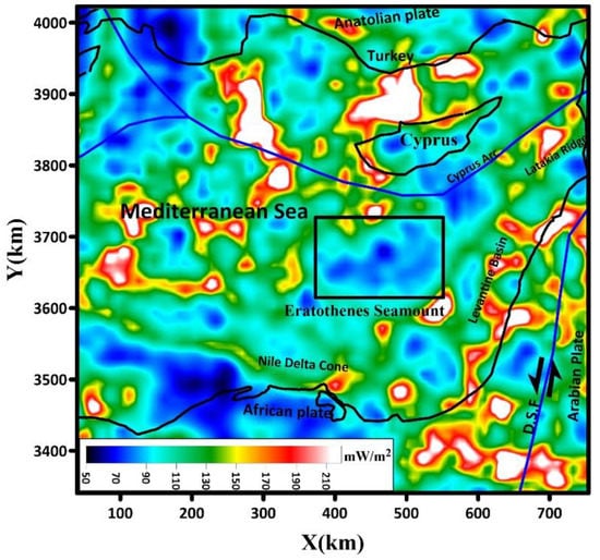 Thus, the heat flow values are generally higher in the northern parts of the Eratosthenes Seamount and decrease in the southern parts, as shown in Figure 6. Furthermore, the heat flow has the high value of nearly 80 mW/m2 in the north of the Eratosthenes Seamount under Cyprus and the surrounding areas, whereas it approaches around 100 mW/m2 under the Eratosthenes Seamount. In addition, this approach has been previously achieved by Özsöz [13]. In correlation with other areas beneath southern Cyprus, the heat flow values are in the range of 50–70 mW/m2, using thermal conductivity equal to 2.5 W/m °C [59]. It is conceivable to argue that lower magnetic values on the RTP map might be related to the thinner magnetic crust where lower CPD or high heat flow values are found.