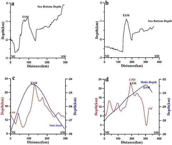 Cross-sections of the CPD map plot along (A) NE-SW and (B) NW-SE directions (profile locations are shown in Figure 5) demonstrating the variation of the Curie point depth, Moho depth and sea bottom depth. (a) the sea bottom depth along profile A, (b) the sea bottom depth along profile B, (c) Moho depth (blue color), CPD (red color) along profile A and (d) Moho depth (blue color), CPD (red color) along profile B.