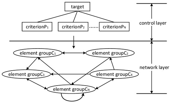 The model is built according to the mutual element relationships. Let the factor indicator set in the control layer in Figure 1 be , and the element indicator set in the network layer be .