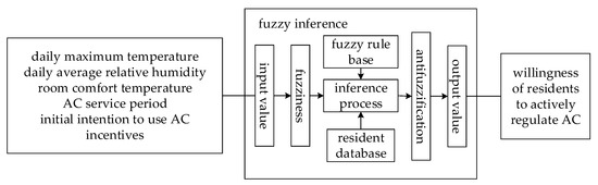 Main element indicators are selected as inputs of the fuzzy inference model, which account for a large proportion in ANP weight analysis. The output is the willingness of residents to actively regulate air conditioners. The structure of the fuzzy logic model for predicting residents’ willingness is shown in Figure 2.