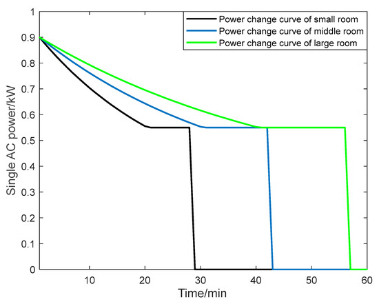 Assuming that the initial outdoor temperature is 30 °C, the indoor temperature is 26 °C, and the set temperature of the air conditioner is 23 °C, it can be known that = 3 °C. In addition, set the and of the AC to be 0.9 kW and 0.55 kW respectively, and a, b, and c to be −0.3276, 3.3782, and 0.1699 respectively. When the indoor air temperature drops to 1 degree below the set temperature value of the AC, the AC runs at the lowest power and keeps it for a period of time, that is, = −1 °C. AC stops running when the indoor air temperature drops to 2 °C below the set temperature of the AC, that is, when = −2 °C. Using Equations (6)–(10) and parameters in Table 2, the simulation step is set to 1 min, and the cooling power of the air conditioner compressor output in each time period can be calculated for the large, medium, and small rooms, as shown in Figure 4.