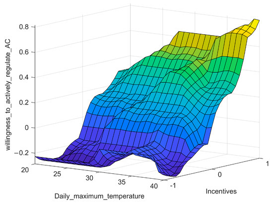 Taken the prediction of the willingness to actively regulate AC of one user as an example, 6 inputs for Fuzzy inference are shown in Table 4. Figure 6 shows the relationship graph of the output willingness with the daily maximum temperature and incentives. Three ‘incentives to willingness’ curves when the daily maximum temperature has certain values of 28, 34, and 38 °C are shown in Figure 7.