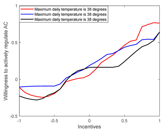 It can be seen from Figure 7 that when there is no incentive, users’ willingness to actively regulate AC is low; with the continuous increase of incentives, users’ willingness to actively regulate AC also continues to rise until it reaches the maximum value. When the negative incentive is small, user’s willingness to regulate the AC decreases continuously until zero; as the negative incentive continues to increase, users’ willingness to regulate the AC increases in a negative direction until saturation. When the daily maximum temperature is different, the curve of user’s willingness also has slight differences. When the daily maximum temperature is 38 °C, user has the greatest positive willingness to regulate. In order to consume the extra PVs in residential areas, the summer daytime hours are generally set to positive incentive periods to encourage residents to use air conditioners more; the summer evening peak hours are set to negative incentive periods to guide residents to use less electricity.