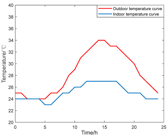 When t = 0, is the initial indoor temperature value, and the initial temperature difference can be calculated by substituting it into Equation (10), and the initial output power of the AC can be calculated by using Equation (9). Use Equation (8) to calculate the initial value of , and then calculate the initial cooling capacity of the AC by using Equation (7). Substitute into the Equation (6), the indoor next moment temperature value can be obtained by combining the room equivalent thermal resistance R, room equivalent heat capacity C, indoor initial temperature , outdoor current temperature value and outdoor next moment temperature value . Substitute into equation (10), and use Equations (6)–(10) to iteratively calculate the indoor temperature value. When the indoor temperature value drops to a certain set temperature value, it jumps out of the calculation cycle and the AC is turned off.