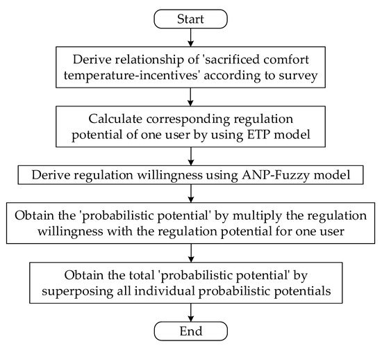 After knowing the temperature difference under incentives and room size, output power of the temperature-control load of a single household can be derived according to above calculation. By multiplying the output power with the regulation willingness of a single household under different incentives, the power potential of a single household can be derived. The power potential actually considers the uncertainty of temperature-control load, that is, not full power can be used in real life due to uncertainly of user behavior. Then the total output power of temperature-control loads in the community can be known by superposing all power potential of a single household.