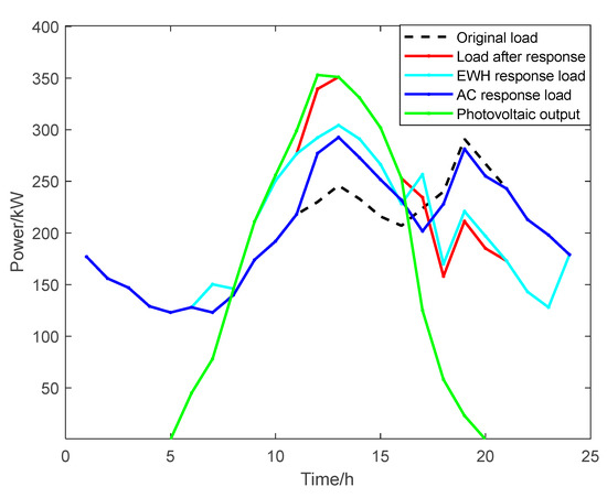 For the AC load, it is transferred from time period of 17–22 to the 15–20 time period under incentives. However, for the EWH load, it is transferred from time period of 18–24 to the 8–16 time period under incentives. The transfer time range for the AC load is 0.5–2 h, it is 8–10 h for the EWH load. The maximum load transferred per hour of the AC load is shown in Figure 11 with the value of 60 kW, and the maximum load transferred per hour of the EWH load is 70 kW. The optimal operation results are shown in Figure 14, Figure 15, Figure 16 and Figure 17.