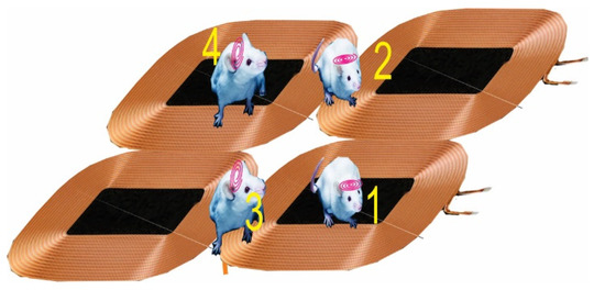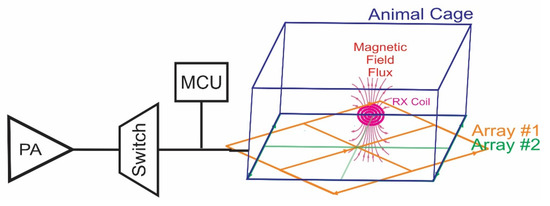 Various methods have been provided to power the receiver. Maximum transmission powers, uniform magnetic field and the elimination of blank spots are the reasons for using such methods [13]. Using a coil as large as the dimensions of the cage to cover the moving area of the receiver is one such method [14]. Although the large coil has a simple structure, it needs to be modified due to the nonuniformity of the electromagnetic field as well as the low efficiency [15]. This method was replaced by the idea of the power transmission array because the power transmitted in the center functions as a peak, and the power decreases around the animal behavior test environment or cage. In the coil array method, the movement of the receiver coil is followed by using several transmitters in an array. Power transmission has higher efficiency and is transferred to the receiver in a localized manner [16,17].
