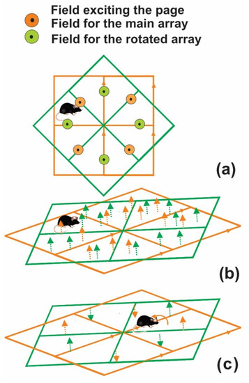 It can be generalized that if one can divide these small squares into smaller sectors, it is possible to increase the number of areas that we can power to a vertical receiver coil. For example, each small square can be divided into three areas by using three arrays of four oppositely excited coils that make an angle of 30° with each other (see Figure 3a). Therefore, the number of areas that a rotated RX could power triples. These areas could increase proportionally for more plates of arrays. For instance, for a receiver with a size of 4 × 4 cm, using 6 arrays, the whole mouse cage can receive power for the 90° rotation of the receiver.