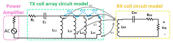 In order to check the correctness of the aforementioned content, we present a circuit model for the presented system and analyze it mathematically. Figure 4 shows the equivalent circuit model of the proposed TX array. We assumed that when the receiver approached each coil of the transmitter array, for example Coil 1, the only coupling that could be calculated was the coupling of element K1 and that the other couplings would be zero (K2 = K3 = K4 = 0). The equivalent output voltage for the parallel connected array in case of coupling to coil #1(M1) is obtained according to Equation (1):