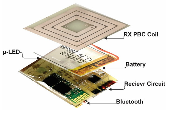 The fabricated and measurement setup for the RX module is presented in Figure 7b,c. To prevent unwanted battery discharge by reverse current, the load battery is connected in series with Schottky diodes. The battery transmits the generated wireless DC power to the load and the μ-ILED for wireless operation. The performance of the proposed sample with important parameters such as transfer coefficient PTE and PDL was measured and reported [22,23].
