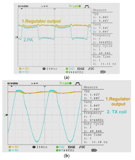 Figure 9 shows the measured output voltage of the PA and the load-delivered voltage in the presence of an 82 Ω load. The RMS input current of the circuit was measured to be about 80 mA. The input of the PA is a pulse with amplitude of about 10 V peak to peak. The output current was recorded at 73 mA. The delivered power to the load is measured 146 mW. Moreover, for 90° rotated RX coil the output voltage of the TX coil (blue line) and regulated load output voltage (yellow line) are measured in Figure 9b. According to the measurements, the output current of 50.54 mA are recorded for a 90°-oriented RX coil with 92 mW power delivery to the load, which gives system efficiency of 11.5%.