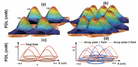 Figure 10 shows the measured and simulation results of the received power on the receiver side at different locations of the receiver on top of the transmitter array. We got the data from measurements at borders and middle point of each triangle created between plates in Figure 3 and used MATLAB to visualize the measurement data in Figure 10. Figure 9a,b shows the delivered power to the load at 4 cm distance with one-layer TX array and star shaped TX array. For simulation results Figure 10c,d, the s-parameter result obtained from HFSS are entered the ADS block diagram to obtain the Magnetic field and distribution. The difference between the field and PDL distribution in the case of the simple array and the Star-shaped array is evident in Figure 10. The proposed array has a more uniform coverage area than the conventional presentation. It also has the advantage of covering the rotation area of the receiver, which is not seen in the common type.