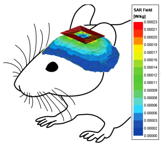 SAR was simulated to check the biocompatibility of living tissue with the proposed array. The SAR simulation in ANSYS HFSSTM at 10 MHz (ISM band) is shown in Figure 11 for 10 W input powers. The SAR obtained at this operating frequency at a distance of 4 cm is 0.20 mW/kg, lower than the IEEE standard of 2 W/kg for 10 g of tissue [12,25].