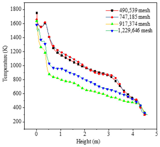 The boundary conditions for the input and outlet stream were set as mass flow inlets and pressure outlets, respectively. The coal composition is given in Table 1. The coal feeding rate was constant at 75 kg/h for all case studies. The stationary wall with the no-slip state (zero velocity) at a constant roughness of 0.5 reflected a normal type of wall and the tangent DPM was polynomial. To control the outflow of syngas, the syngas outlet was set as the pressure outlet condition. The energy and momentum equations were decoupled by the implicit pressure, and the steady-state simulation was carried out. The SIMPLE algorithm was employed for coupling the pressure and velocity. Due to the large grid size, parallel processing was used in the numerical calculation. Temperature is the most influential factor in the gasification process, which is why it was chosen for the grid sensitivity analysis. Figure 2 shows the mesh geometry and a close view of the top nozzles and outlet. First, cold flow simulations were selected for four various grids. Furthermore, temperature contours for all the grid sensitivity analyses are shown in Figure 3. The grid analysis for 490,539 and 747,185 showed a similar temperature around the center of the gasifier. Further simulation results were independent of the grid; therefore, a 917,374 grid size was chosen for other simulations at various O2/coal ratios (0.9, 1, and 1.1) and different wall temperatures (1200, 1500, and 1800 °C), as shown in Table 4.