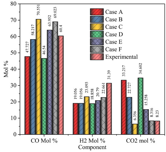 The syngas composition was the best parameter for a comparative study between various reaction mechanisms and experimental results. Figure 5 shows the mol % of CO, H2, and CO2 for various preliminary reactions and experimental results at a constant O/C = 1. Figure 5 shows that the maximum CO mol % was 70.51, and the minimum CO was found in the D case at 46.54%, but the CO mol % was 60.4% in the experimental results. LiJun et al. [39] also investigated reaction mechanisms and found that the CO mol % was less than 65%. Compared with the simulation results, the H2 mol % was higher in the experimental results; indeed, case C had the maximum mol % among the other simulated cases, but the maximum H2 % in the experimental result was 31.39% and case C had 23.09%, while the minimum mol % was found in case D, which was 18.85%. The CO2 composition was unsatisfactory in cases A, B, and D, which were 33.39, 22.72, and 34.60%, respectively, but the minimum CO2 was found to be 6.35% and 8.23% in case C and the experimental results, respectively. Therefore, it is clear from the above discussion that case C showed the best syngas composition regarding the experimental analysis. An ideal reaction mechanism was found in case C, which neglected the oxidation of CO and the proper gasification of char and volatiles was found. Therefore, case C was selected for further simulations.