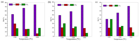 The temperature and O/C ratio were the key parameters that influenced the gasifier performance because the oxygen-blown drop tube furnace strongly depended on the oxygen concentration. Due to the combustion reaction, CO2 was produced, along with heat released as an endothermic reaction as a result of CO and H2 formation. This study simulated nine cases at various O/C values (0.9, 1, and 1.1) and various temperatures (1200, 1500, and 1800 °C), as shown in Table 4. Figure 6 shows the effect of O/C and temperature on the syngas composition. Figure 6a shows the effect of an O/C ratio = 0.9 at different temperatures. It is clear from Figure 6a that as the temperature increased from 1200 °C to 1800 °C, the CO mol % also increased from 52.03% to 75.06%, the H2 % decreased from 29.57% to 5.95% as the temperature increased, and the CO2 % decreased from 18.39% to 16.76% from 1200 to 1500 °C and then increased slightly up to 18.98% at 1800 °C. Furthermore, Figure 6b,c show the same trend of CO % as in Figure 6a, but the H2 and CO2 trends were quite different. In Figure 6b,c, H2 % was stable at 19% to 20%, but CO2 % decreased with temperature. In general, CO2 % increased the O/C ratio because of the water shift reaction, but as the temperature increased, the CO2 % decreased because a high temperature was not favorable for the water–gas shift reaction. Figure 6b,c show that the temperature and O/C ratio did not have a great impact on the H2 % yield; the reason for this was the non-availability of steam for the water–gas shift reaction because all the simulations occurred in pure oxygen.
