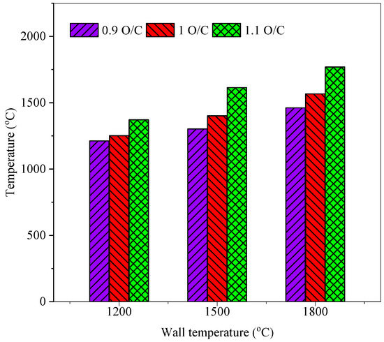 The temperature parameter was one of the critical parameters in the gasification/combustion reaction, and increasing the oxygen concentration also raised the temperature profile in an upper section of the gasifier. Figure 7 shows the temperature at the exit of the furnace; it is clearly shown that the temperature at the exit of the furnace increased as the wall temperature and O/C ratio increased. The maximum and minimum temperatures were found at 1770 °C and 1212 °C for cases 1 and 9, respectively. Further, Figure 8 shows the overall temperature profile in the upper part of the gasifier with increasing wall temperature and O/C. The maximum temperature of 2200 K was observed because a high oxygen concentration resulted in exothermic reactions in the upper part of the gasifier.
