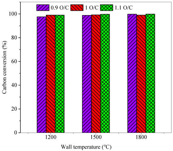 The overall variation in the carbon conversion rate shown in Figure 9 was between 97 and 99.8%. It is clear from Figure 9 that the carbon conversion increased with increased wall temperature and O/C ratio. The minimum and maximum carbon conversions were found to be 97.5% and 99.8% in case 1 and case 9, respectively.