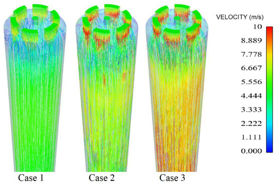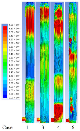 The effect of the turbulence intensity and velocity are shown in Figure 10 and Figure 11. The turbulence intensity was predicted by solving the equation of the reliable k–ε model from Equations (5)–(9). The upper part of the gasifier showed the maximum turbulent intensity range observed at 300–400% because the gasifier’s upper part was the main combustion reaction zone. Therefore, it was ensured that a higher mixing rate occurred in the upper part of the gasifier. Furthermore, Figure 11 shows a close view of the velocity profile. The velocity of the particle increased as the temperature and O/C ratio increased. The maximum velocity was observed at 10 m/s and the velocity increased as the height of the gasifier decreased.