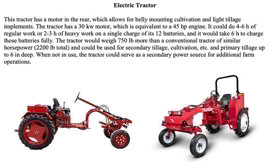 BET prototype as described and shown to participants. Photos c/o Ronnie Baugh Iron Horse Tractors (https://ronnietractors.com/, accessed on 14 November 2022) and Tilmor (https://www.tilmor.com/en-us/products/33/tilmor-tractor?sc=46-11105, accessed on 14 November 2022).