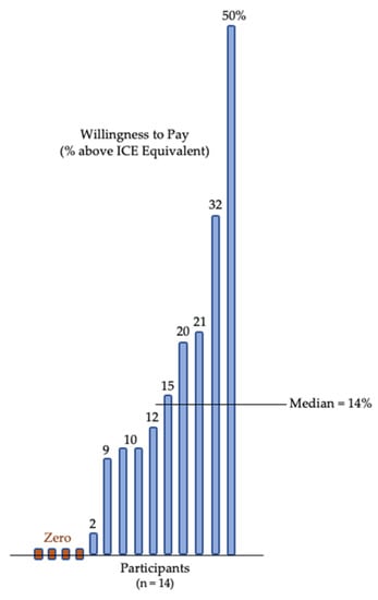Premium each of 14 participants were willing to pay for a BET over an ICE-tractor alternative, represented as a percentage of the average ICE-tractor cost. Median premium is provided only for those participants willing to purchase a BET.