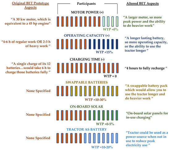 After describing the prototype BET and allowing growers to respond, we then altered 6 elements of design including (i) motor power, (ii) operating capacity, (iii) charging time, (iv) battery pack, (v) on-board solar, and (vi) tractor as supplemental power, asking growers how much more (or less) they were willing to pay for that alteration and why. This allowed us to examine growers’ interest (or lack thereof) in specific improvements to the BET, most of which would increase the cost or complexity of the BET’s design.