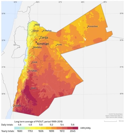 Another concern that exists regarding the current desalination plants in Jordan is poor brine discharge management []. At present, approaches for proper brine disposal remain unclear for many ongoing BW desalination plants. In the context of the water–energy nexus, the poor spotlight on proper brine management approaches related to desalination plants constitutes a central environmental concern in Jordan, which can harm the soil, flora, and the quality of nearby water resources [,]. To address these challenges, a previous study has shown that implementing PV energy in energy-intensive technologies such as desalination could represent a great solution to improve energy and economic efficiency for various economic sectors and industries in Jordan []. Based on the results of this study, PV panels were installed at multiple BW desalination plants in Jordan, especially those related to the agricultural sector, contributing to favorable reductions in overall water and energy losses and costs. Solar energy is considered plentiful in Jordan, as shown in Figure 1.