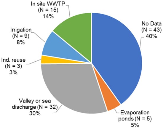 It was estimated that the combined daily amount of generated brine for all operating plants in the country is 61,148 m3/d (about 22.3 MCM/yr), with the average salinity of the brine being 8274 ppm, measured as TDS. Figure 2 depicts the brine disposal practices of desalination plants in Jordan. Basically, 30% of plants discharge their generated brine into valleys or nearby seas, 8.4% of the plants use the brine for irrigation (with or without blending it with low-salinity water), 4.7% of the plants have evaporation ponds, 14% of the plants dispose of their brine into an on-site wastewater treatment facility, and about 40% of the plants did not offer any data in this regard.