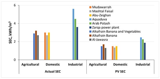 SEC in actual situation and when using PV solar energy by sector (kWh/m3).