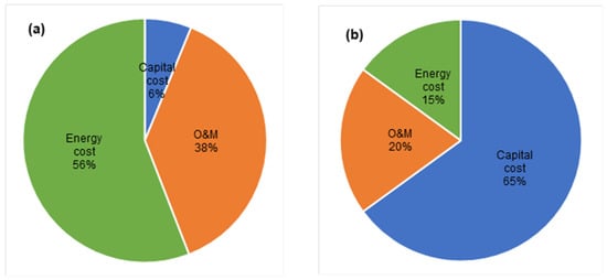 Cost comparison per energy source for the industrial BWRO desalination plants. (a) Electricity network; (b) PV solar energy.