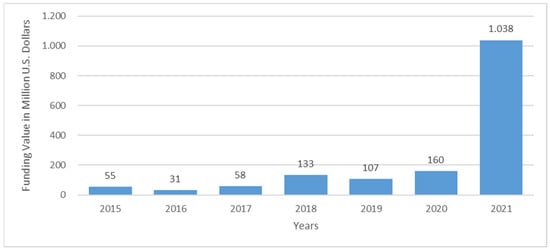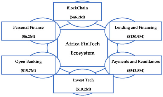 Funding secured by FinTech start-ups in Africa from 2015 to 2021. Source: Statista, https://www.statista.com/statistics/1249965/african-fintech-startups-funding/ (accessed on 10 August 2022).