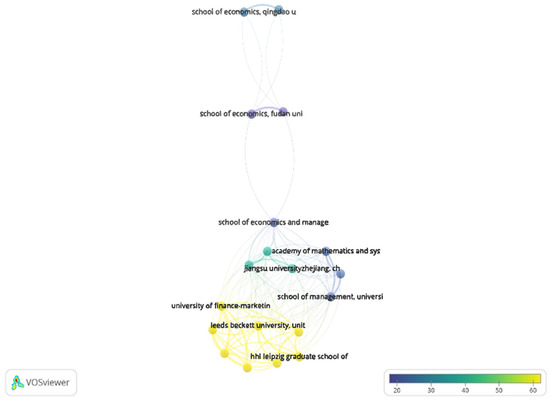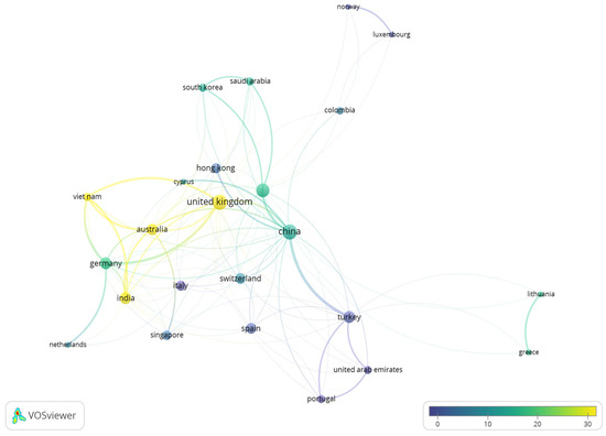 The five generated clusters are all connected with the FinTech keywords. The first identified cluster (red colour) contains 22 items (in the co-occurrence analysis, the items are keywords) such as (China, climate change, financial regulation, public policy, etc.). Retrieving a word such as “China” in a cluster means that China is one of the countries interested in the FinTech concept and this may be due to many factors such as the level of environmental degradation in China. A word such as “financial regulation” in the same cluster illustrates the connection between China as a country and the regulation concept. The second cluster (green colour) has 17 items, followed by cluster number three (blue colour) with the most mined keywords considered to be instruments and products used in the FinTech industry. The fourth cluster (yellow colour) contains six items and the final cluster (violet colour) has the lowest number of items (five items).