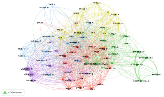 The co-citation analysis network depicted in Figure 7 illustrates the item similarity between the 35 encountered documents during the systematic-cum-bibliometric review related to green FinTech and green economic growth; five clusters were identified. The co-citation analysis has three units of analysis (cited references, citer source, cited author). Figure 7 displays the cited author option; five clusters were identified.
