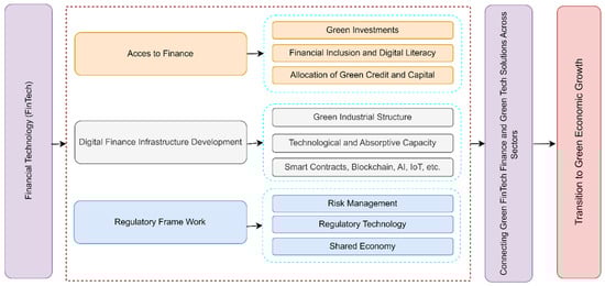 As found in much recent research, FinTech innovation can promote green finance and increase green credit and green investment [33]. The use of a green cycle of instruments and projects in a country leads to enduring green sustainability for future generations. The discussed ecosystem elements mentioned in Figure 5 can be used as instruments for a transition toward green economic growth. One of the objectives of this study is to design an integrated framework of FinTech as an enabler of the transition to green sustainability for African countries, which should be used as a cornerstone in designing and implementing FinTech projects.