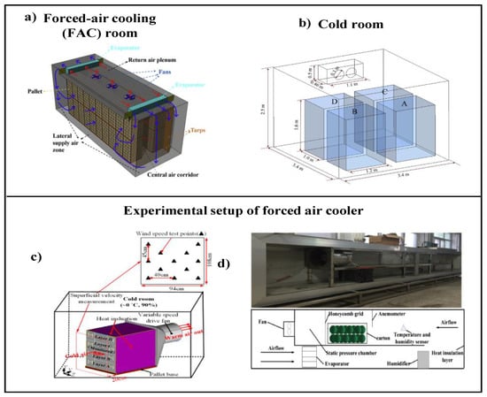 Different experimental setups built at different scales: (a) [23] and (b) [24] scale of a refrigerated facility, (c) [25] scale of a pallet, (d) [26] scale of one box.