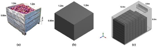 (a) Wooden bin loaded with randomly packed fruit (b) porous medium model of a bin (c) porous replica of bins placed in a cold room [46].