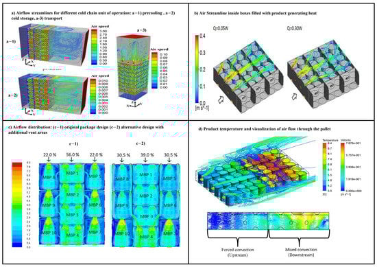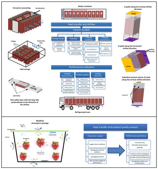 Field studies are essential to track the time-temperature evolution along the cold chain. These measurements map the temperature inside the pallets and thus reveal unacceptable deviations from the optimal temperature [19,20,21]. Despite the measurements in actual industrial conditions, which are essential, real-time monitoring of product temperature at each cold link is a difficult task given the practical limitations of instrumenting each box in a product pallet [22]. Airflow and heat transfer studies, both numerical and experimental, aim to better understand and interpret the airflow behavior inside and around the packages and its influence on the temperature distribution. Further, these studies aim to understand how these physical phenomena affect product quality to prevent post-harvest losses effectively. These investigations cover different cold chain units and deal with several features, including products, packaging types, dimensions, stack loading, and packaging stacking arrangement.