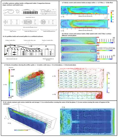 Airflow patterns inside a cooling unit for different cold chain links found in the literature (a) [33], (b) [28], (c) [51], (d) [78], (e) [63], and (f) [50].