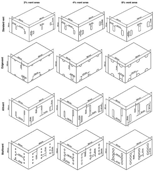 - Berry, T.M.; Fadiji, T.S.; Defraeye, T.; Opara, U.L. The role of horticultural carton vent hole design on cooling efficiency and compression strength: A multi-parameter approach. Postharvest Biol. Technol. 2017, 124, 62–74. [Google Scholar] [CrossRef]