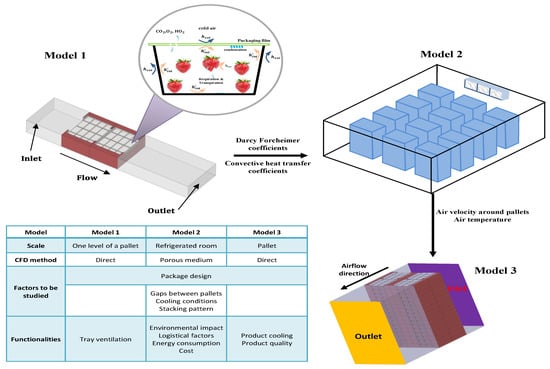 The design and complexity of the packaging depend on the characteristics of the product (e.g., shape, heat of respiration, and physical surface of the product), the cold chain unit of operation, and phytosanitary requirements to maintain product quality. There is a different layer of packaging. Some products are placed right into cartons [23,30,64]; then these boxes are placed on pallets and are ready for post-harvest cooling. Products like strawberries, kiwifruits, or table grapes are wrapped in multi-layer packaging. Before being placed in boxes, the products are packed in plastic clamshells or carry bags, providing additional protection to maintain quality. This additional layer can be modified atmosphere packaging (MAP) which is a technique that combines the benefits of cold storage (low temperature and high relative humidity) for horticultural crops. Air composition inside the MAP is altered (lower O2 and higher CO2 levels) to extend the shelf life of fresh horticultural products by slowing their respiration rate and the development of microorganisms [84]. However, MAPs are by definition close and limit great heat exchange with the surrounding air. The more layers that are added to the package, the more complicated the study of airflow, heat, and mass transfer becomes.