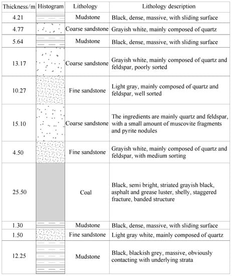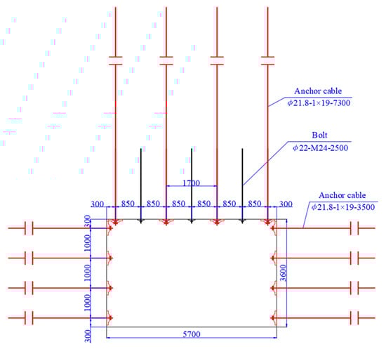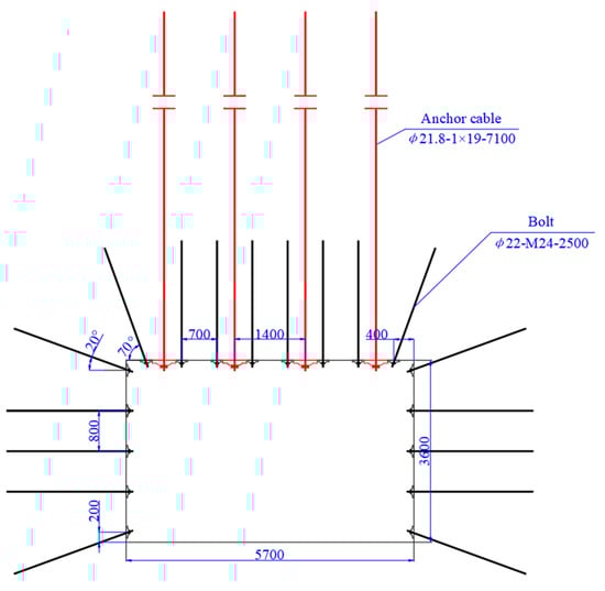 The 40307-belt transport roadway has a maximum burial depth of 752 m. The roadway is located in the middle of the #4 coal seam. The #4 coal seam, along with its roof and floor, has a weak rock burst tendency. The roadway surrounding the rock has a maximum principal stress of 21.23–30.17 MPa, which is in the direction approximately perpendicular to the roadway axis. Multiple layers of hard sandstone roofs have a thickness of more than 10 m in the overlying strata above the working face, with a strong dynamic load disturbance of the roofs. The histogram of coal and rock strata is shown in Figure 1. The roadway has a cross section of 5.7 × 3.6 m and is supported by an anchor mesh. The roof anchor bolts are Φ22 × 2500 mm left-handed threaded steel anchor bolts without a longitudinal reinforcement, arranged at spacings of 700 × 800 mm, each with a pretension of 120 kN. The roof anchor cables are Φ21.8 × 7100 mm high-strength prestressing steel strand cables, arranged at spacings of 1400 × 1600 mm, each with a pretension of 200 kN. The side anchor bolts are Φ22 × 2500 mm left-handed threaded steel anchor bolts without a longitudinal reinforcement, arranged at spacings of 800 × 800 mm, each with a pretension of 120 kN. The support parameters of the surrounding rock of the roadway are shown in Figure 2.