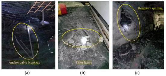 Roadway deformation and failure diagram. (a) Anchor cable breakage; (b) floor heave; (c) roadway spalling.