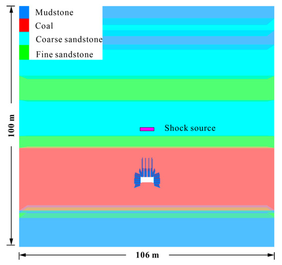 A 106 × 10 × 100 m three-dimensional model was built using FLAC3D according to the geological conditions of the working face and the mechanical parameters of the coal rock. The mesh size of the model elements was 1 × 1 × 1 m. The numerical model is shown in Figure 4, and the mechanical parameters of the coal and rock are shown in Table 1. Adopting the Mohr–Coulomb criterion, the model was subjected to loads of 23.25 MPa and 17.4 MPa in the horizontal and vertical directions, respectively, and had fixed boundaries all around. A free-field boundary condition on the dynamic load was adopted for the model. The model was loaded using static and dynamic modules in sequence, as shown in Figure 5. The static load convergence rate of the numerical model was 10−5. The dynamic shock was applied in the form of a cosine wave with a frequency of 50 Hz over three vibration cycles, using a local damping coefficient of 0.2. The dynamic shock was applied at 20 m above the roadway roof with shock intensities of 10 MPa (104 J), 30 MPa (105 J), 60 MPa (106 J), and 100 MPa (107 J). The dynamic calculation time was 0.3 s. The dynamic response characteristics of the surrounding rock and support elements of the roadway under different shock intensities were simulated.