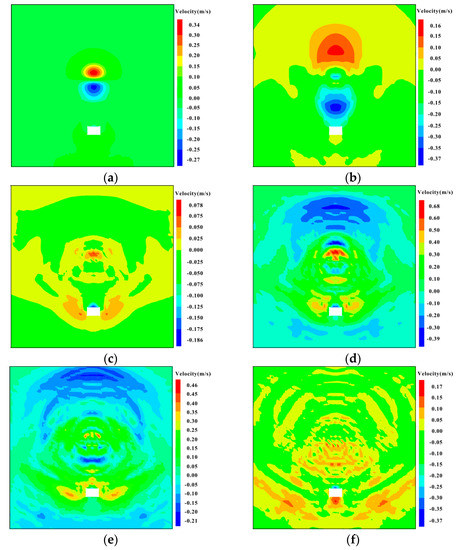As shown in Figure 6, the shock source released energy, and the dynamic shock stress wave was centered at the source and transmitted outwards as a spherical shape in the coal rock mass. The dynamic stress wave energy caused the surrounding rock mass to vibrate, and the rapid vibration of the mass dissipated the dynamic stress wave energy. In the early stage of vibration (0 s), the shock source caused high-velocity vibrations of the surrounding rock mass near the source, with the vibrations reaching a velocity of 0.35 m/s. At 0.01 s, the dynamic stress wave was transmitted to the roof of the roadway, and the roof mass vibrated at a velocity as high as 0.31 m/s. At 0.02 s, the dynamic stress wave was transmitted to the two sides and floor of the roadway, where the surrounding rock mass vibrated at velocities of 0.078 m/s and 0.024 m/s, respectively, and the energy of the dynamic shock stress wave decayed as it propagated from near to far. Then, the roadway surrounding rock was subjected to a periodic cyclic dynamic load, and the disturbance range of the dynamic stress wave was further expanded. When the shock time was greater than 0.06 s, the release of energy by the shock source ended, and the residual stress wave inside the roadway surrounding the rock relied on the low-velocity vibration of the surrounding rock mass to dissipate the dynamic load energy.