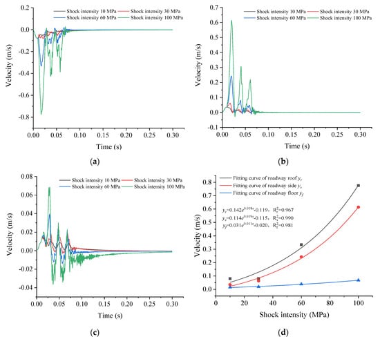 Velocity–time curve of the surrounding rock of the roadway for different shock intensities. (a) Roadway roof; (b) roadway side; (c) roadway floor; (d) maximum velocity fitting curve.