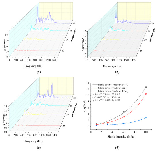 Acceleration frequency−amplitude curve of the surrounding rock of the roadway for different shock intensities. (a) Roadway roof; (b) roadway side; (c) roadway floor; (d) maximum amplitude fitting curve.