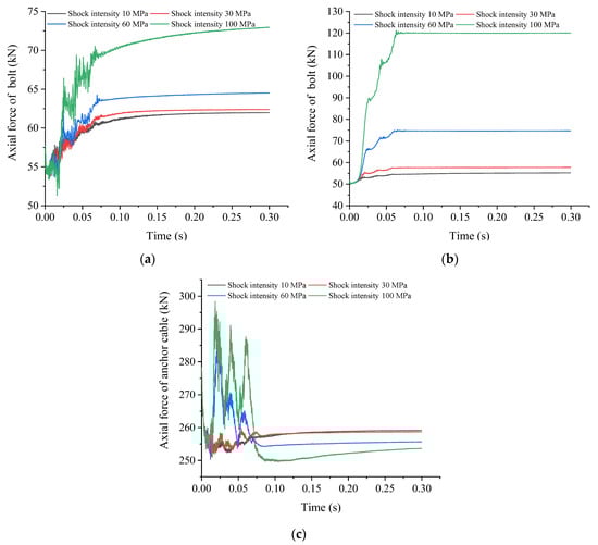 Axial force–time curve of anchor cables (bolts) for different shock intensities. (a) 2.5 m bolt of the roadway roof; (b) 2.5 m bolt of the roadway side; (c) 7.1 m anchor cable of the roadway roof.