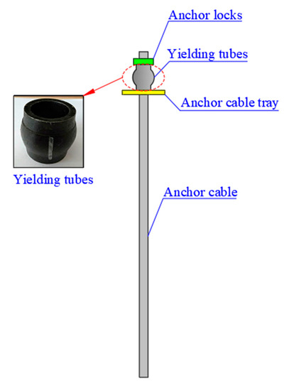 The existing roadway support systems are characterized by anchor bolts with a short length, a low pretension, and a corresponding weak side-control effect in the sides and anchor cables, with a high pretension and a low shock resistance in the roof. To address this problem, a “full anchor cable yielding” support technology is proposed for the roadway, i.e., the roof is supported by long anchor cables, yielding tubes, and anchor bolts, and the sides are supported by short anchor cables. The support system is specifically designed as follows: the roof support adopts Φ22 × 2500 mm left-handed threaded steel anchor bolts without a longitudinal reinforcement, arranged at spacings of 850 × 1000 mm and with a torque of 400 N·m, and Φ21.8 × 7300 mm high-strength prestressing steel strand anchor cables with yielding tubes, arranged at spacings of 2000 × 1700 mm and with a pretension of 300 kN. The side support adopts Φ21.8 × 3500 mm high-strength prestressing steel strand anchor cables, arranged at spacings of 1000 × 1000 mm and with a pretension of 200 kN. The support parameters of the surrounding rock of the roadway are shown in Figure 11, and the yielding anchor cable is shown in Figure 12.