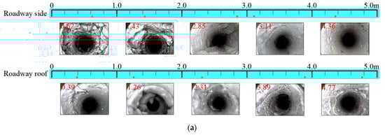 As shown in Figure 13, before the optimization of the support parameters, the depth of the fractures developed in the roof and sides was 4.86 m and 3.15 m, respectively, indicating a severe fracturing of the surrounding rock, and that the surrounding rock in the 0.62–1.43 m section of the roof and the 0.39–1.26 m section of the side exhibited fragmentation spalling. After the optimization of the support parameters, the depth of the fractures developed in the roof and sides was 1.88 m and 1.52 m, respectively, which were 61.32% and 51.75% lower than that before the optimization, respectively. In addition, short and small fractures were mainly observed in the surrounding rock, indicating that the fracturing of the surrounding rock was significantly mitigated. As shown in Figure 14, after the optimization of the support parameters, the deformation of the roof, sides, and floor of the roadway decreased by 52.61, 76.91, and 57.09%, respectively, indicating that the stability of the roadway surrounding the rock was significantly improved and the control effect on the surrounding rock was effectively enhanced. The control effect of the surrounding rock of the roadway is shown in Figure 15.