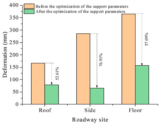 Deformation of the surrounding rock of the roadway before and after the optimization of the support parameters.